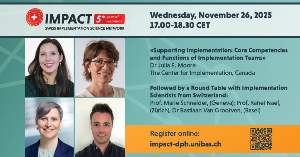We are excited to announce our IMPACT Webinar Series 2025. This year will again consist of four webinars, hosting leading international and Swiss implementation scientists. In addition to presentations on hot topics in implementation science, the final webinar will also include a roundtable discussion. We look forward to your participation!